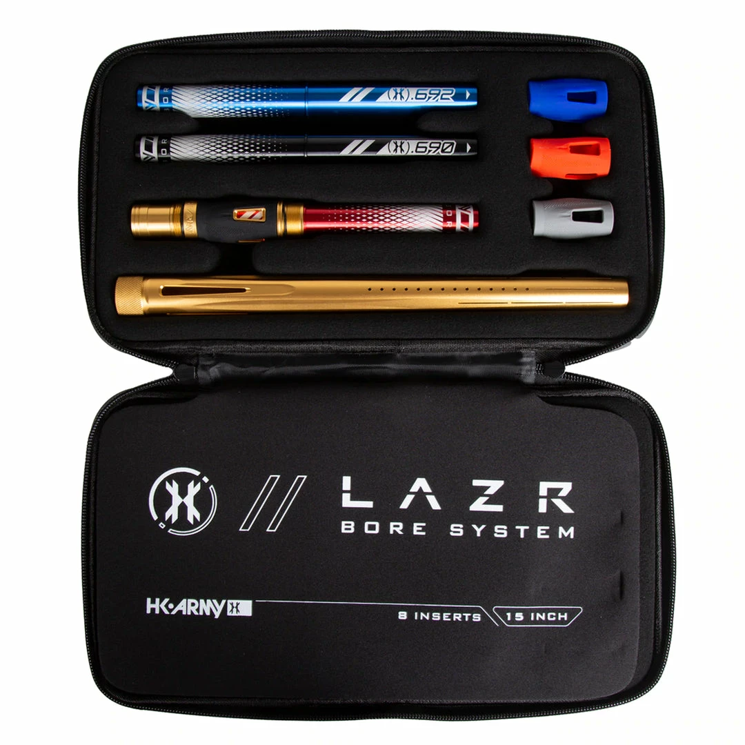 The LAZR Barrel Kit comes complete with 8 Barrel Bore Inserts, a Barrel Tip and 4 Interchangeable Accent Grips. The LAZR barrel is packaged in our custom HK Army Hard Shell Exo Barrel Case.