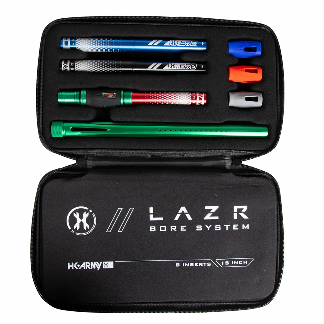 The LAZR Barrel Kit comes complete with 8 Barrel Bore Inserts, a Barrel Tip and 4 Interchangeable Accent Grips. The LAZR barrel is packaged in our custom HK Army Hard Shell Exo Barrel Case.