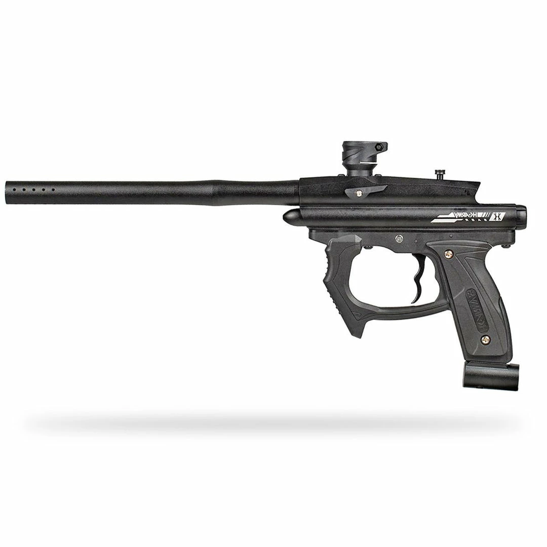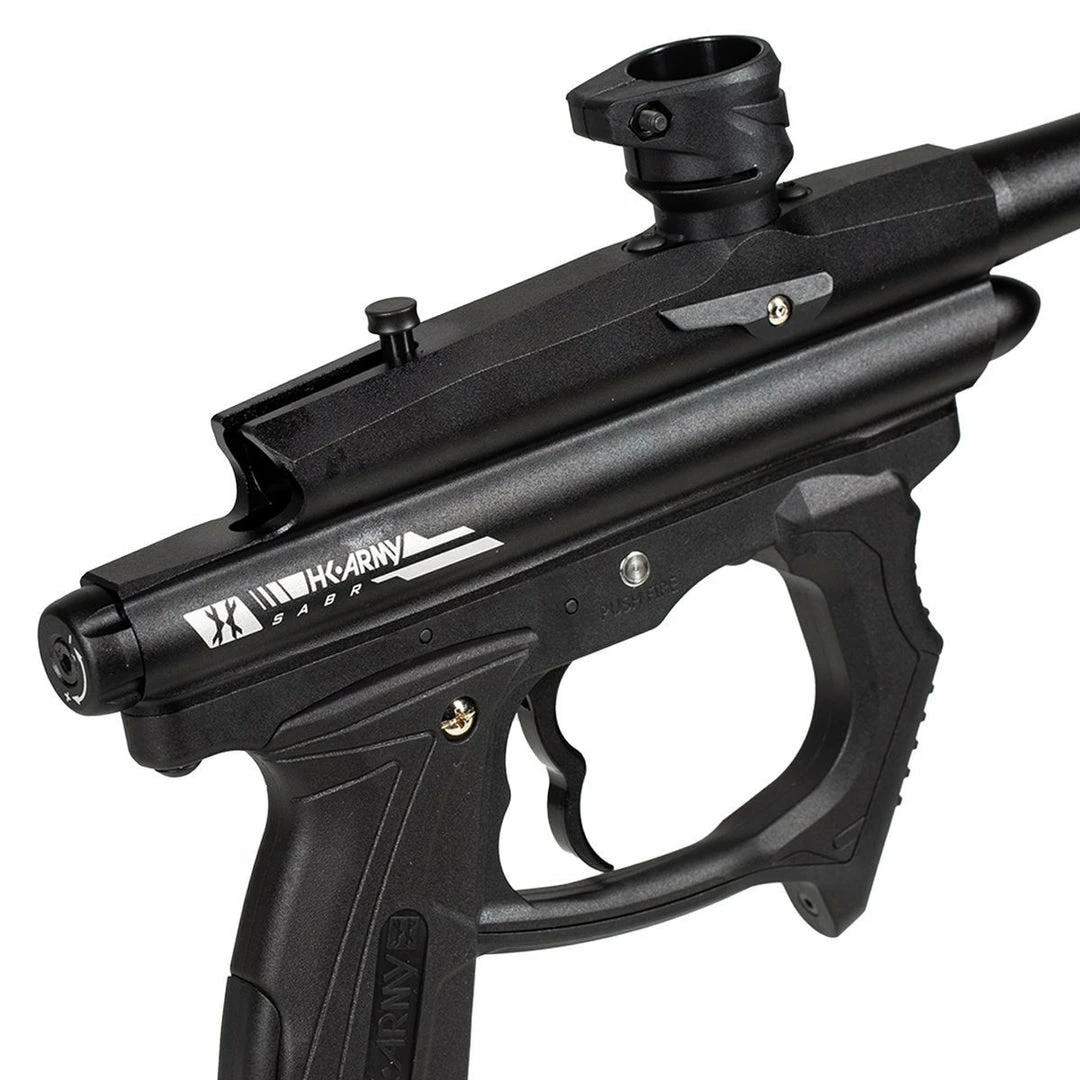 The HK Army Sabr paintball gun has arrived and is ready to help you slice up the competition! Impressive features and a simple, time-tested mechanical blowback operating system combine at an amazing price that’s within reach of any paintball player with the HK Army Sabr! A semi-automatic paintball gun with a double trigger for faster firing, the HK Sabr paintball gun offers extremely useful features like a clamping, vertical feed neck to secure practically any hopper, a hose-free design that eliminates external air hoses that might fail, and an Autococker-threaded, twelve inch ported barrel for accuracy and consistency! Simple to maintain thanks to its quick-pull Delrin, self-lubricating bolt, easy-access ball detents and simple, clearly marked velocity adjustment, the HK Army Sabr is able to operate on CO2 or compressed air, and offers impressive looks and performance for an unbeatable price!