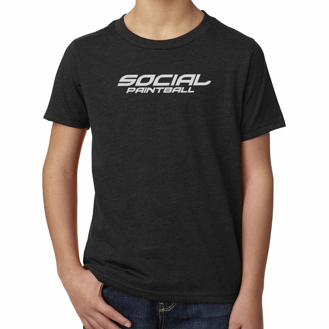 Social Paintball logo printed on front of black shirt. Signature blended style, super-soft crew, preshrunk 60% combed ringspun cotton, 40% polyester jersey, 4.3-oz., 32 singles for extreme softness, 1×1 rib-knit set-in collar, satin label. Made in the USA.