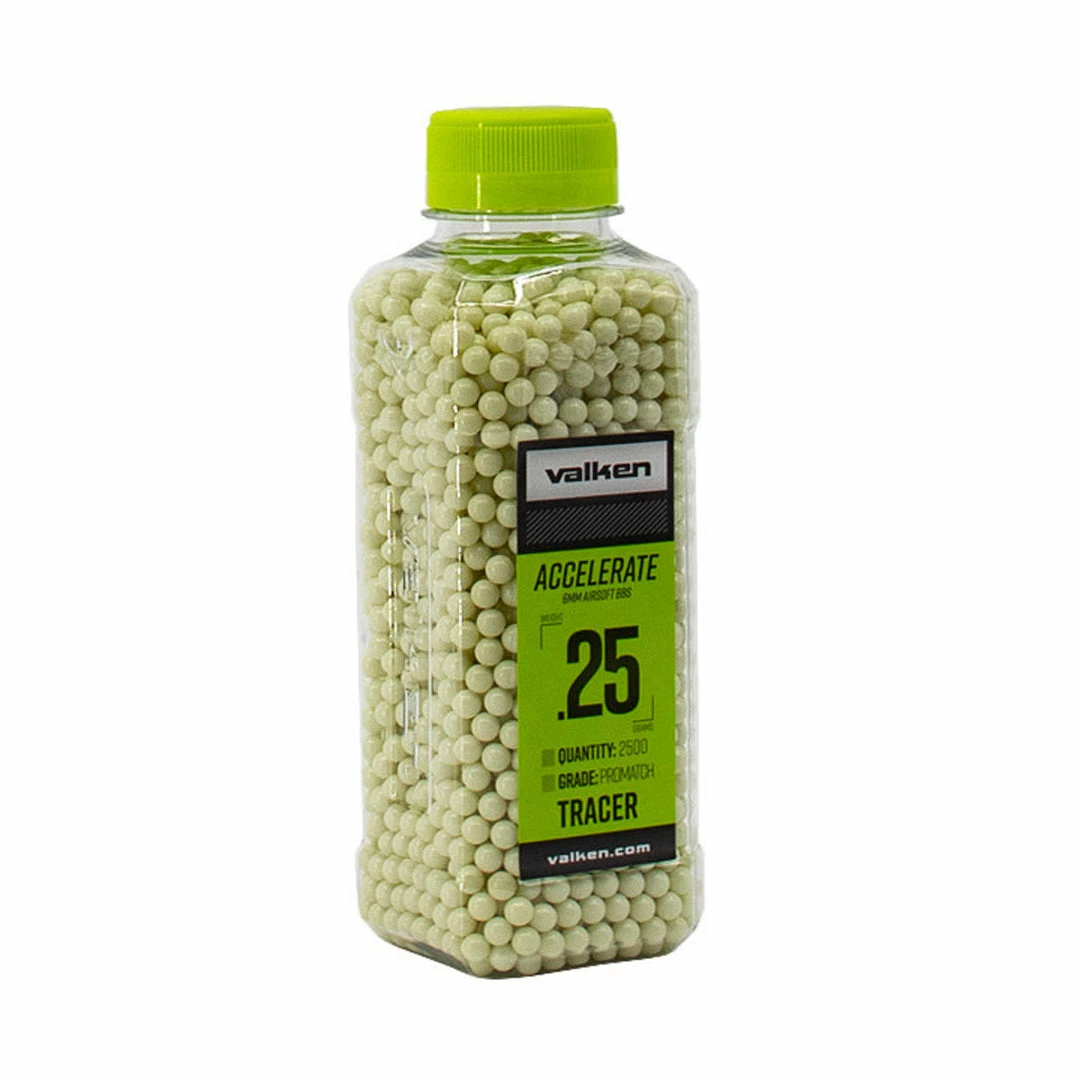 The Valken Accelerate ProMatch Tracer 0.25g airsoft BBs are manufactured in Taiwan by one of the best known Airsoft BB manufacturers. These 6mm plastic BBs glow bright green when using a tracer unit or tracer magazines. They are precision grade quality, completely spherical, and polished to ensure that the BB is seamless and has no surface imperfections. These 6mm precision BBs give you greater accuracy and consistency, and they are packaged in a unique rectangular bottle with a screw-on cap making storage, transport, and loading simple and convenient. Accelerate BB bottles do not roll around like other round bottles, which can spill easily. We recommend our Valken Kilo Tracer Unit for use with Accelerate BBs.