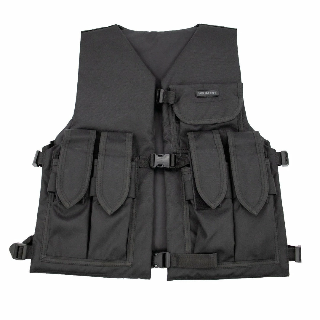 Carry pods in a tactical paintball loadout or airsoft rifle magazines, and take the sting out of incoming rounds with the Valken Bravo padded vest! The Valken Bravo Vest combines the best features of an affordable paintball vest with a paintball chest protector, giving a paintball player the ability to carry four 100 or 140 round pods plus accessories like player ID badges or a barrel cover in a secure pocket in an adjustable, padded camouflage or black vest. And this padded vest is not just for paintball players, but airsoft players too! Airsoft players can also carry airsoft rifle magazines, speed loaders and more. Easy to clean and affordable, the Valken Bravo padded vest is the ideal affordable chest protector and load carrying solution!