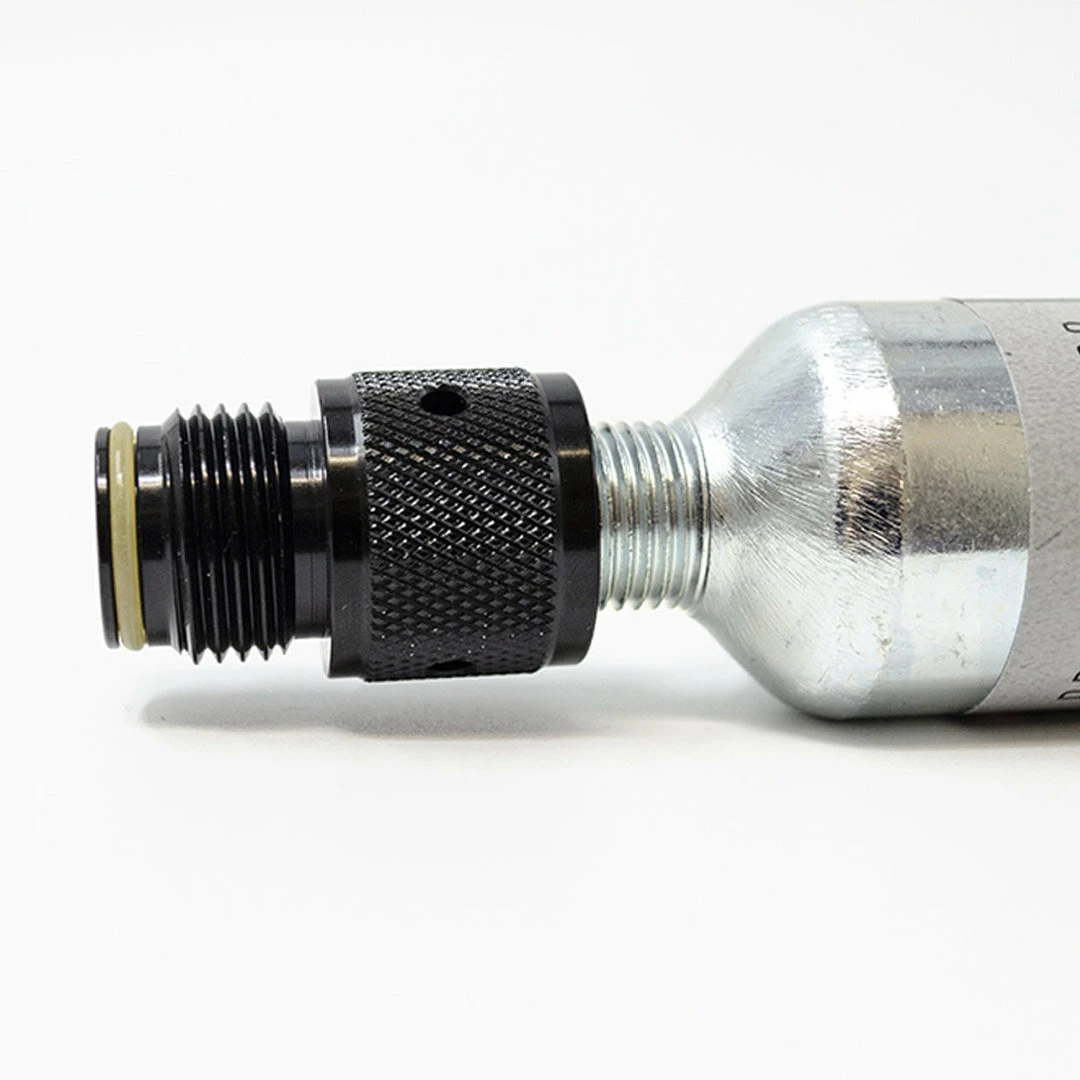 This screw in CO2 adapter for paintball threads into the air source or bottle adapter on any paintball gun designed to use CO2 as a power source, allowing the user to power their paintball gun with disposable Valken 90 Gram CO2 cartridges. This 90 gram CO2 adapter is safe and simple to install and operate, allowing the user to power their paintball gun with much larger, 90 gram cartridges to obtain more shots before replacement is required.